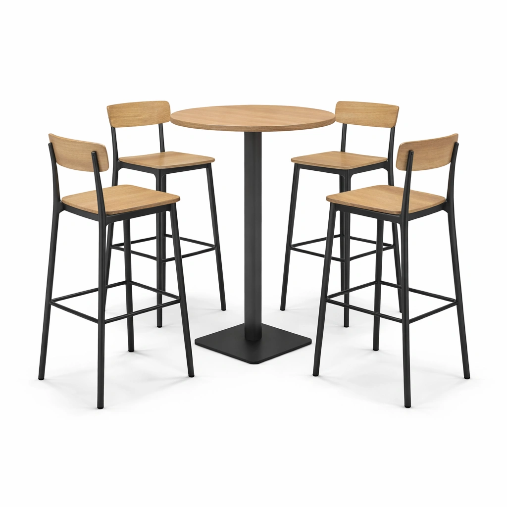 Material: Tischplatte und Sitzflächen aus MDF mit Eichenfurnier, Rahmen aus pulverbeschichtetem Stahl