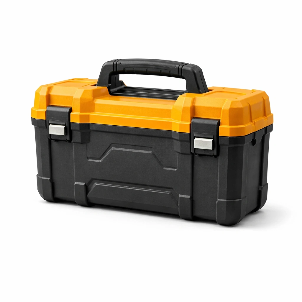 Der Werkzeugkoffer besteht aus robustem ABS Kunststoff und bietet Platz für verschiedenes Werkzeug. Er ist in Schwarz und Orange gehalten. Der Koffer misst 45 cm in der Länge, 25 cm in der Breite und 20 cm in der Höhe und wiegt 2.5 kg. Metallschließen sorgen für sicheren Verschluss, während der Tragegriff den Transport erleichtert. Die maximale Belastung beträgt ca. 15 kg.